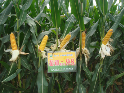 特征特性:該品種為早熟品種,夏播生育期95天,活稈成熟。 株型緊湊,株高250cm,穗位100cm左右,穗長20cm 左右,穗粗5.0cm左右,穗行數(shù)16行。白軸,半硬粒型,軸細(xì)粒深,出籽率90%以上。