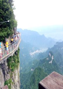 7日早上,我們來到了此行第一站——天門山。天門山海拔1500多米,因自然奇觀天門洞而蜚聲世界,被譽為“湘西第一神山”和“武陵之魂”。我們乘著觀光大巴沿著逶迤曲折的公路盤旋而上,只見壁立千仞,懸崖萬丈,每逢轉彎,車內一片驚呼,盡顯刺激與緊張。下車后,我們繼續(xù)前行,當大家爬過999層階梯最終到達巨大的天門洞前時,不禁感嘆大自然的鬼斧神工,神秘玄奇。往下眺望,林木蒼翠,山腳下的湖波像綠寶石一樣鑲嵌其中,美不勝收。清風徐來,令人神清氣爽,視野開闊,豪氣頓生。天門山上的玻璃棧道,依峭壁凌空而建,讓人望而生畏,行而卻步。大家都小心翼翼,體驗雙腳處于萬丈深谷之上的驚險。