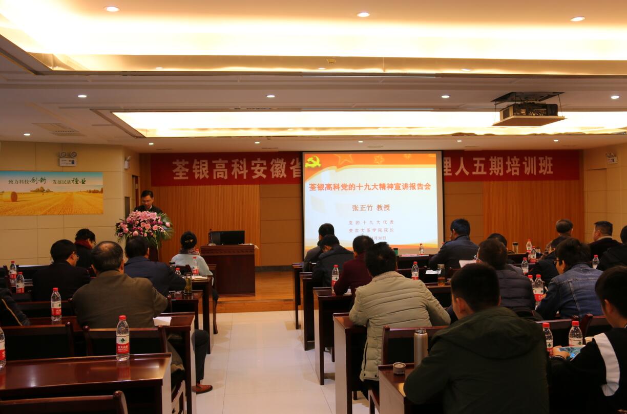 2017年11月30日上午,為深入學(xué)習(xí)宣傳中國共產(chǎn)黨第十九次全國代表大會精神,荃銀高科邀請黨的十九大代表、安徽農(nóng)業(yè)大學(xué)茶與食品科技學(xué)院院長張正竹教授來公司作黨的十九大精神宣講。宣講報(bào)告會在荃銀高科六樓多功能廳舉行,公司經(jīng)營班子成員、全體黨員、安徽省首屆農(nóng)業(yè)職業(yè)經(jīng)理人學(xué)員以及公司部分員工參加了學(xué)習(xí)。會議由公司黨支部書記廖孝波主持。
