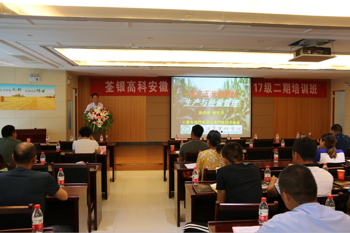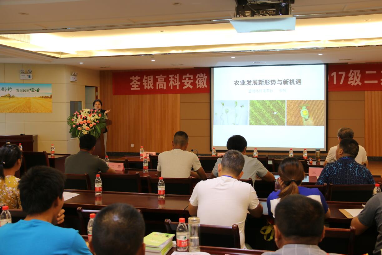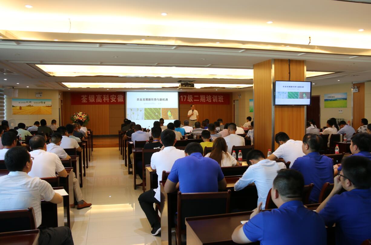 ??? 2018年7月19日,由安徽省農(nóng)委主辦、荃銀高科承辦的安徽現(xiàn)代青年農(nóng)場(chǎng)主培訓(xùn)2017級(jí)第二期培訓(xùn)活動(dòng)在公司六樓多功能廳展開(kāi)。安徽荃銀高科董事長(zhǎng)張琴、營(yíng)銷總監(jiān)王玉林,培訓(xùn)班總教務(wù)長(zhǎng)楊惠成老師,安徽張海銀基金會(huì)秘書(shū)長(zhǎng)張彤,及來(lái)自全省各地的100多位從事種植業(yè)的農(nóng)場(chǎng)主學(xué)員參加了培訓(xùn)。