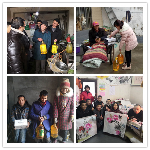 ??? 農(nóng)資捐贈活動結(jié)束后,荃銀農(nóng)投、基金會、壽縣金豐公社還為壽縣迎河鎮(zhèn)6戶因病因殘等病困家庭送去生活物品和慰問金。因車禍致殘癱瘓在床24年的韓兵用繩子綁住手,趴在床上的現(xiàn)場作畫,看到他身殘志堅,樂觀向上的精神,在場的每位人士深受感動和由衷欽佩。