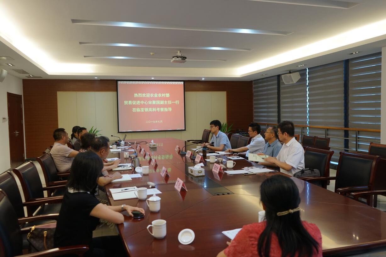 ??? 2019年7月9日,農(nóng)業(yè)農(nóng)村部農(nóng)業(yè)貿(mào)易促進中心宋聚國副主任一行蒞臨荃銀高科調(diào)研指導(dǎo),省農(nóng)委外事外經(jīng)處處長韋艾平、調(diào)研員閆玉平等陪同調(diào)研。荃銀高科副董事長、總經(jīng)理張琴,副總經(jīng)理江三橋等熱情接待了宋聚國副主任一行。